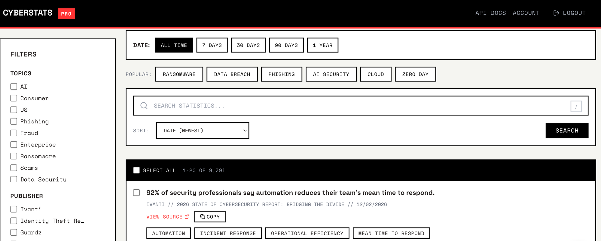Pro cybersecurity trend dashboard with advanced filtering by topic, date, publisher and more plus one-click copy + CSV export. Search through 8,000+ statistics with precision and ease.