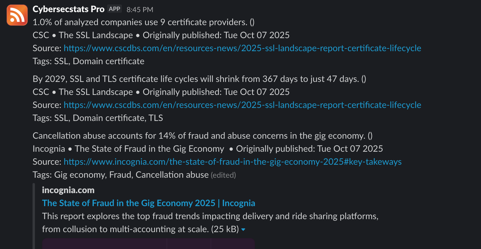 Fresh cybersecurity trend data in JSON,RSS, or CSV. Send stats to your internal dashboards, AI projects or even your team's slack channel.